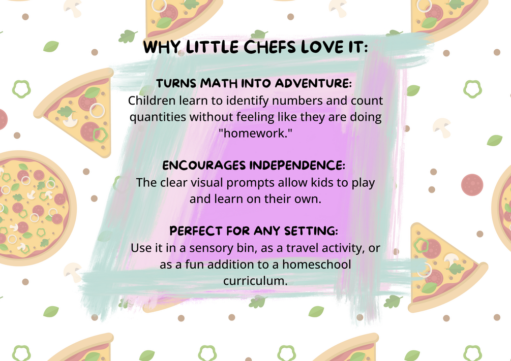 Are you looking for a way to make early math feel like a game? The Pizzaria Counting Kit is a digital printable designed to transform your sensory bin or playroom into a bustling Italian kitchen. Instead of traditional worksheets, children take on the role of a "Chef," following specific recipe orders to build the perfect pizza.